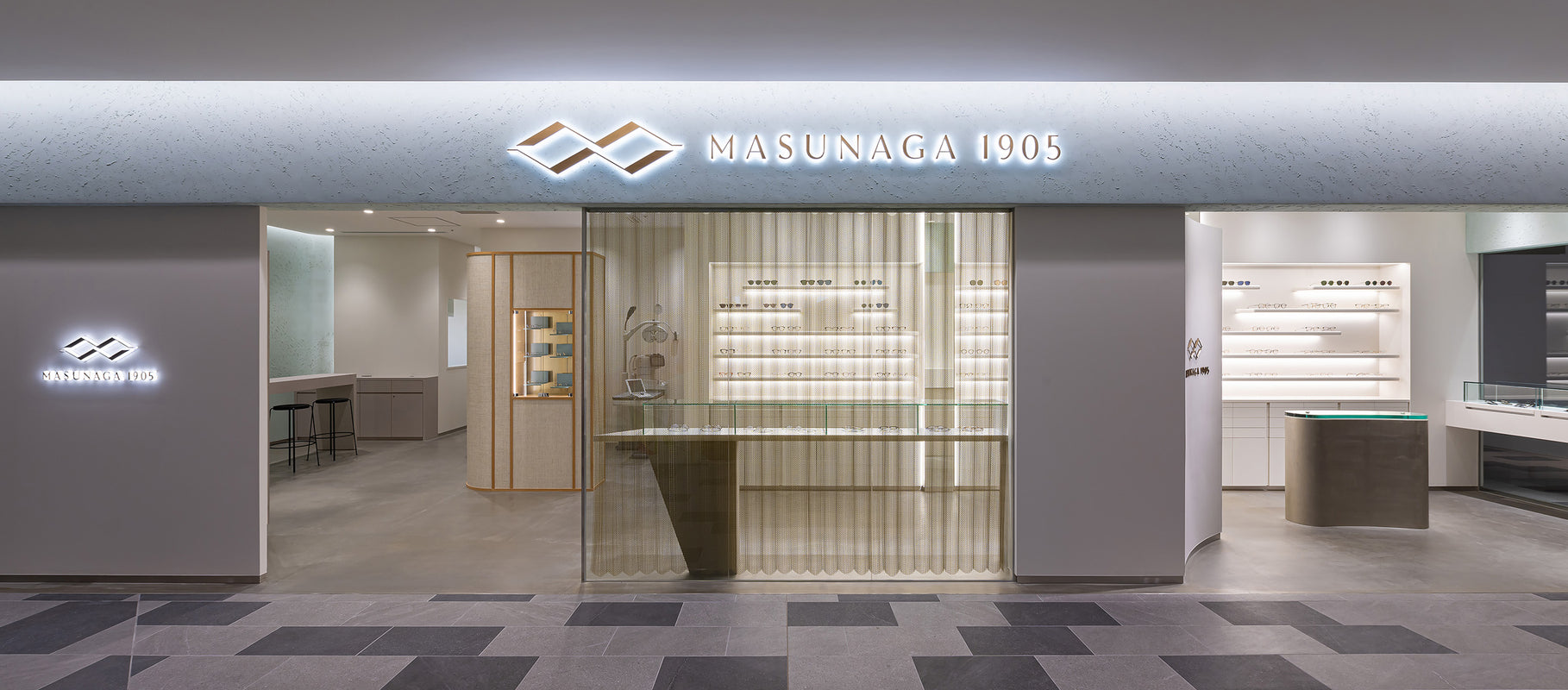 全体に曲線的なデザインを間接照明で表現し、ブランドコンセプトである上質さと福井のものづくりを感じられる店舗でゆっくりMASUNAGAの眼鏡選びをぜひお楽しみください。
