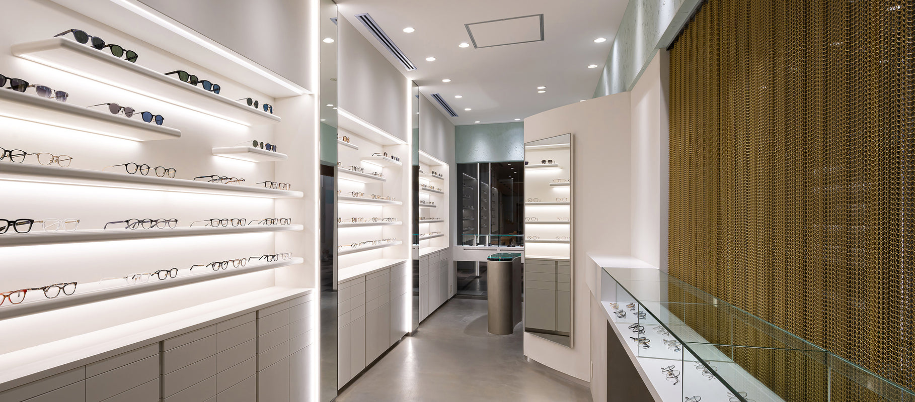 奥行の浅い空間を活かし、壁面全体に象徴的な陳列棚を設けて前面の通路を歩く人々に曲線の壁やメッシュの隙間からリズミカルに眼鏡が見え隠れするよう演出しています。