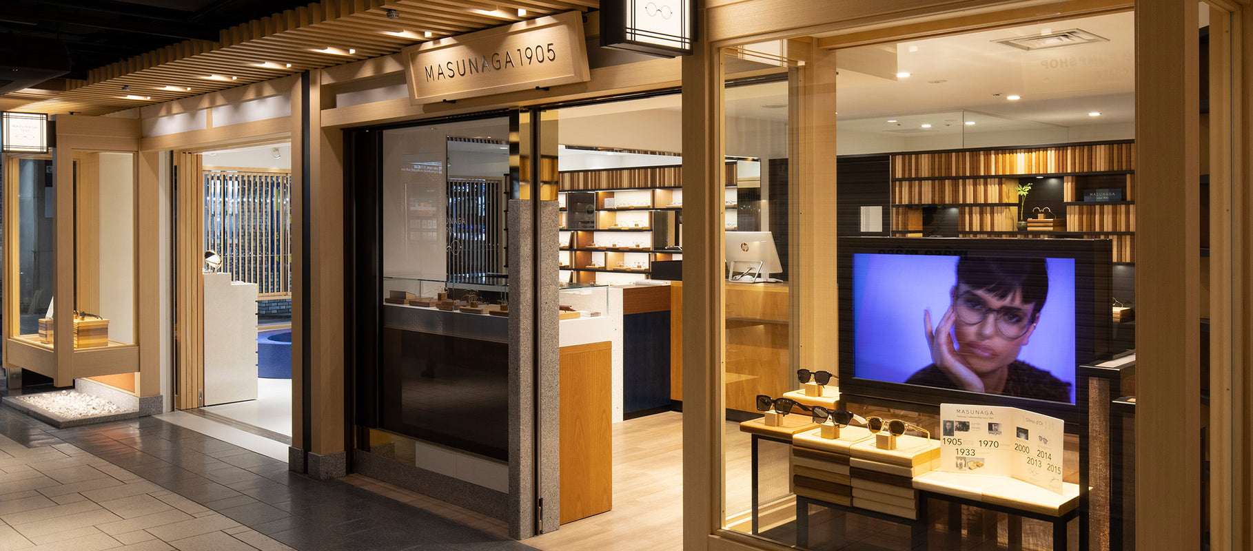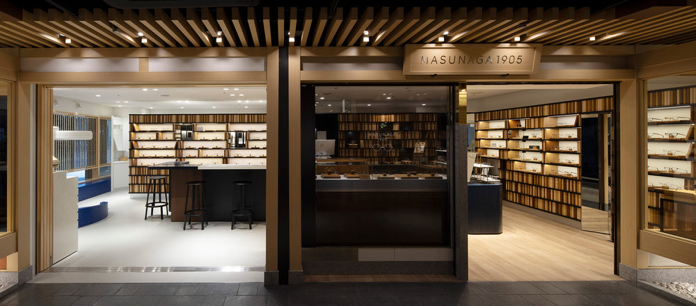 MASUNAGA1905阪急三番街店は古書や古美術が並ぶ「阪急古書のまち」と「和」をコンセプトに掲げた大阪梅田のストリートゾーン「うめ茶小路」に2017年にオープンしました。日本伝統の組子を取り込んだ落ち着きのあるストリートで展開する当店は、木の温もりを感じられる空間になっています。またCarl Zeiss Vison Japan製の3D測定機器「VISUFIT 1000」を設置しており3Dバーチャル試着が可能です。