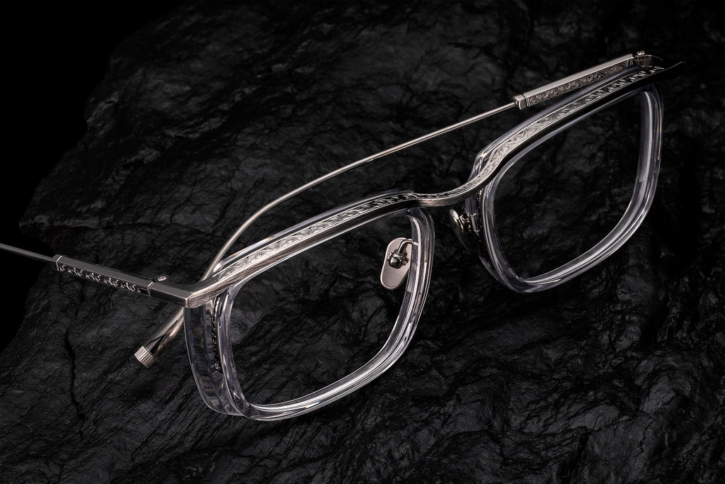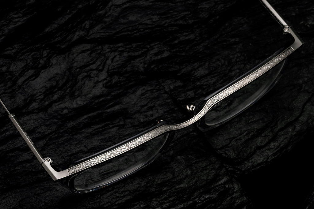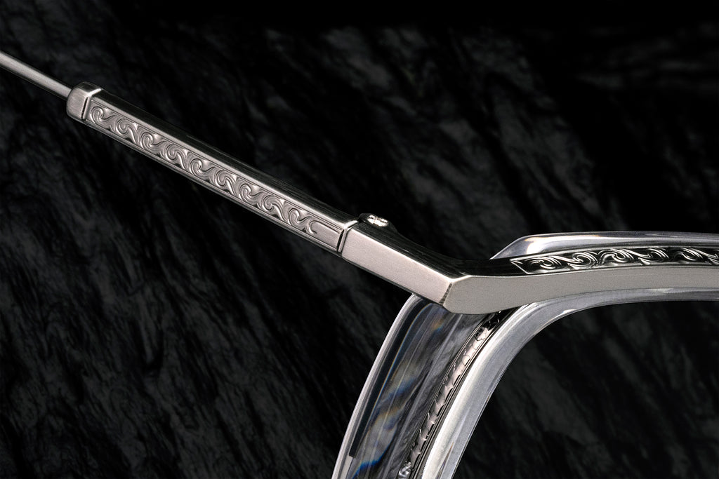FUJIは、人気モデル“KIRI”を元としたヴィンテージ感あふれるカールトンタイプのコンビネーションフレーム。浅めの玉型でオプティカルとして掛けやすく、新たな幕開けを感じさせる一本に仕上がりました。フロントのトップバー、テンプルの表裏には高度なプレス技術による唐草模様が刻まれ、その意匠を引き立てる落ち着いたカラーのアセテート生地をセレクト。エレガントさを体現するフレームとして完成しています。