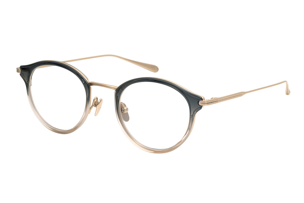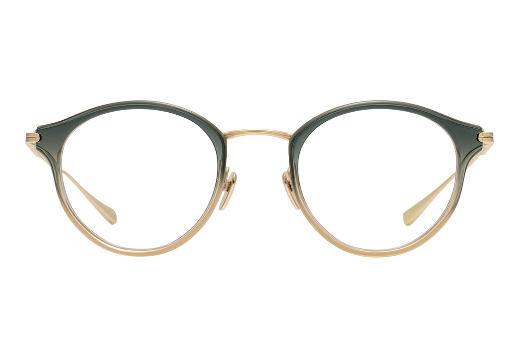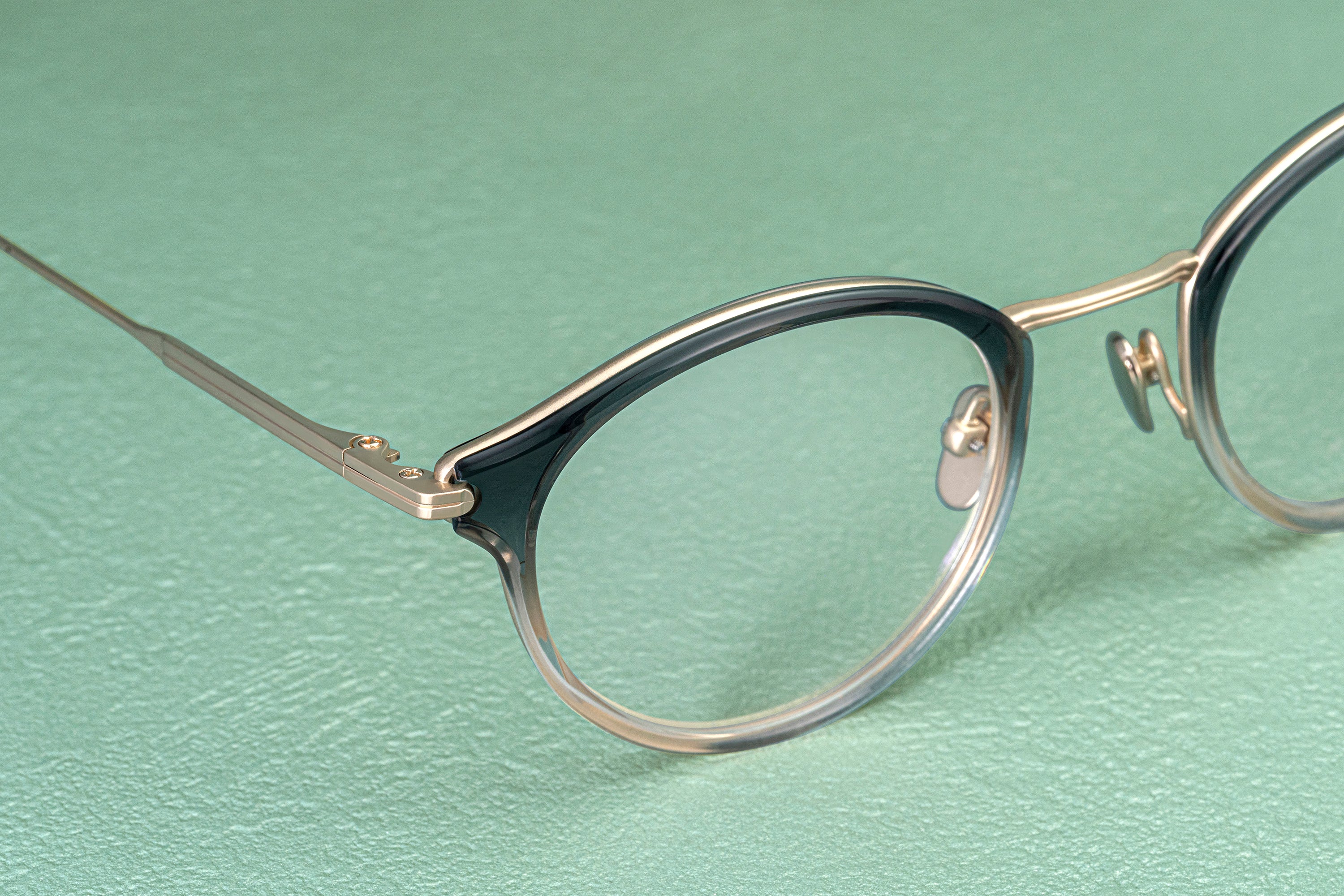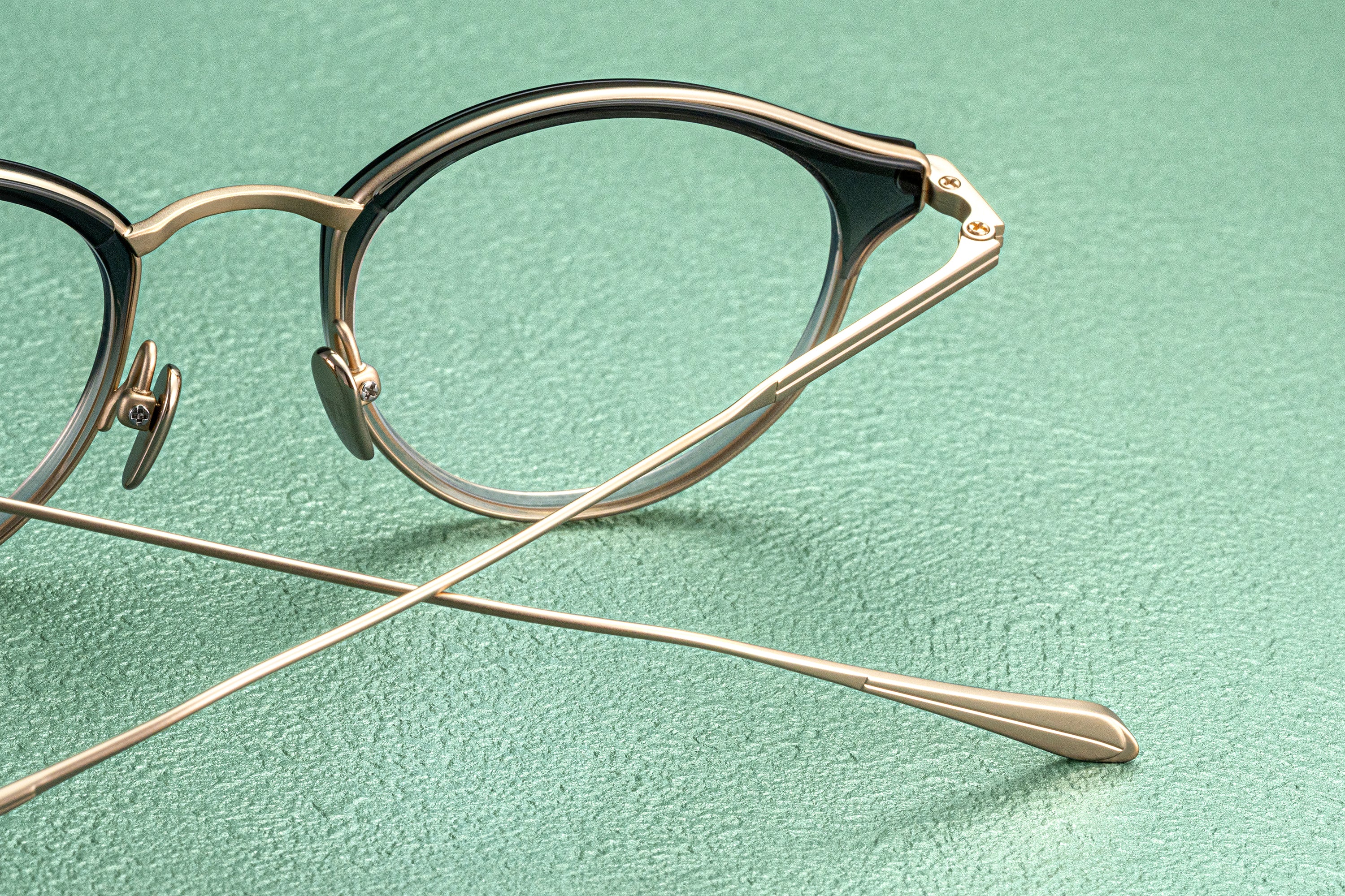 優美なメタルとスリムな印象のプラが織りなす上品なコンビネーションフレーム。アイコニックなボストンシェイプのプラリムは独自のカッティングで軽快な印象に。#38 MOSS/GPはグレーのグラデーション生地を採用。重すぎないカラーリングで肌馴染みがよく、ヨロイ部のゴールドがアクセントかつ全体を引き締めます。
