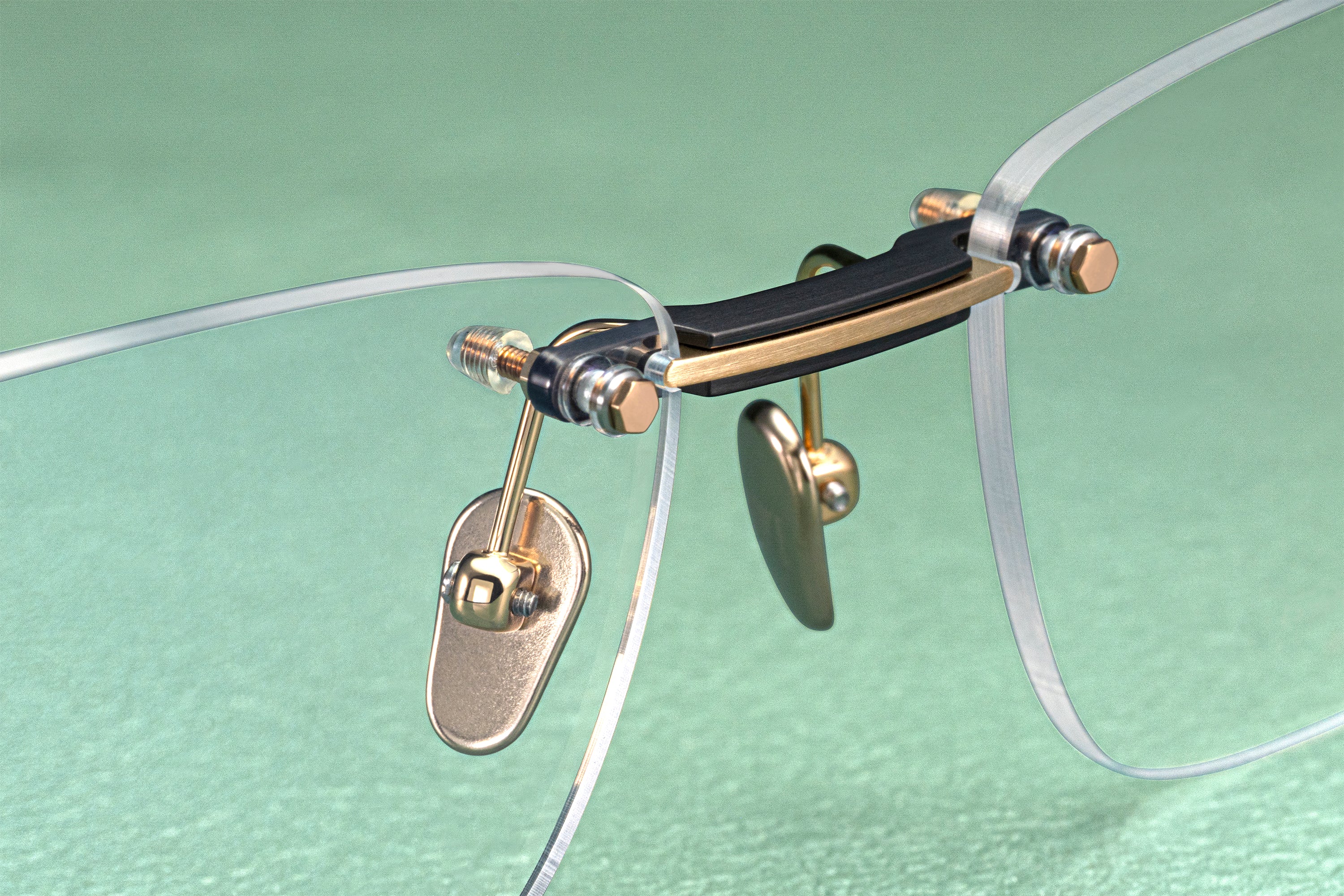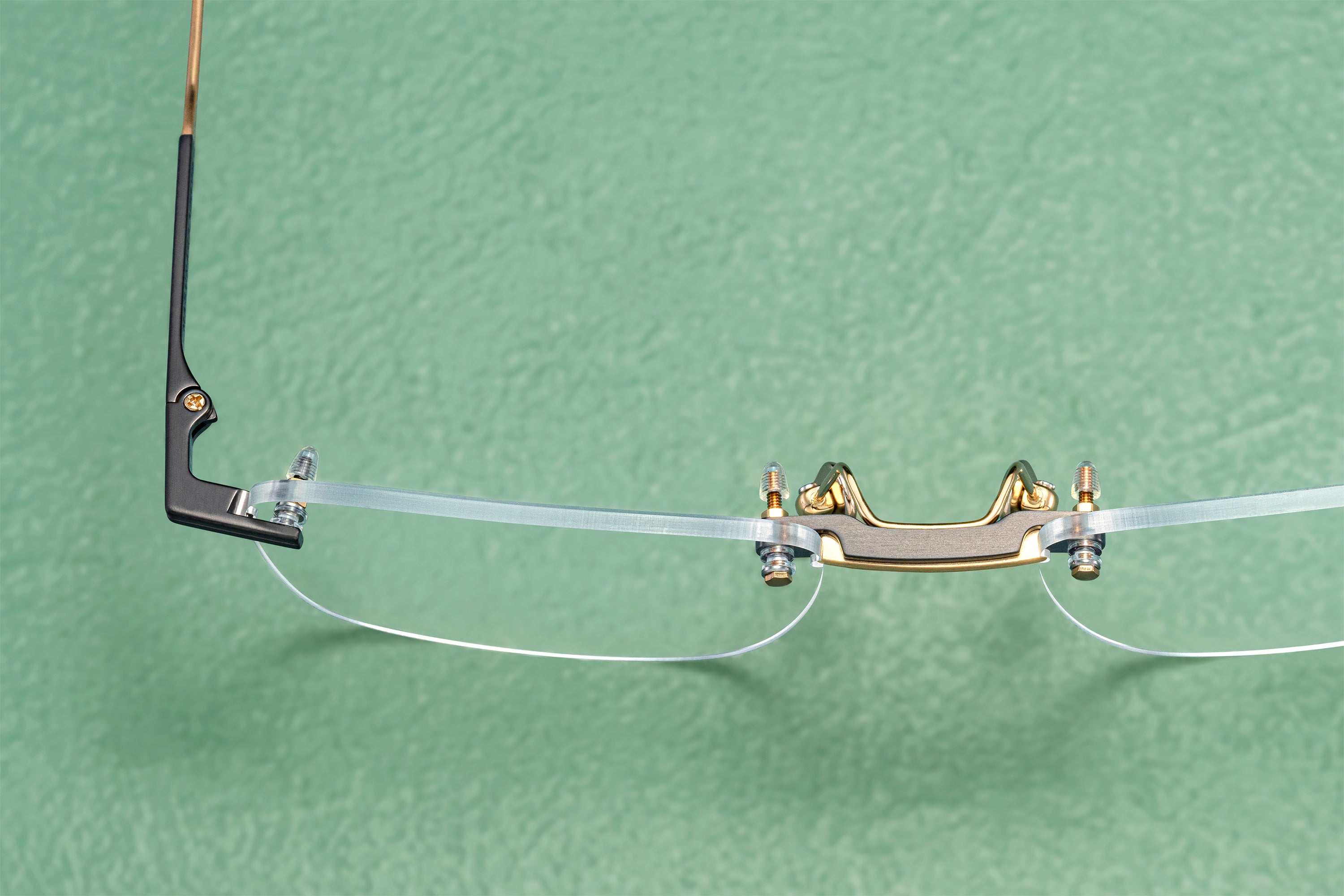二重構造のブリッジは細かなカラーリングの実現と、フレ止めという機能をデザインの一部に落とし込むことでデコラティブとファンクショナルが融合したパーツに。リムレスの潔い造形だからこそ、ネジ、ナット一つひとつまでカラーリングにこだわることで洗練された仕上がりになりました。