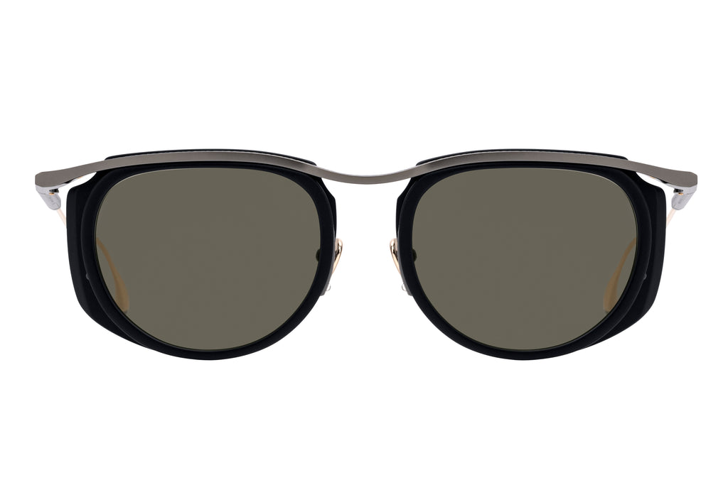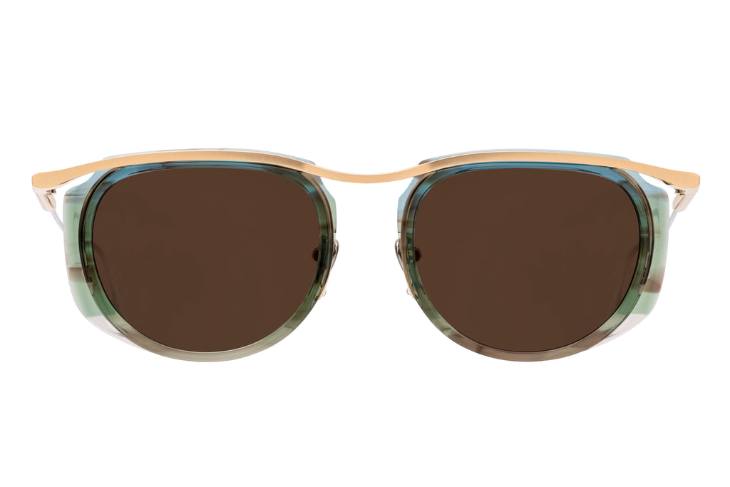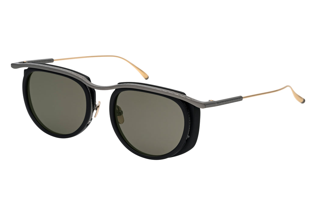 YUGIRIは “FUJI” と同様に、カールトンタイプのコンビネーションフレーム。フロントのアセテートには8mm生地を採用し、段差や傾斜を複雑に取り入れた立体的な造形によって生まれる濃淡が、生地本来の個性を最大限に引き出します。 #35 BLUE/GP では、MASUNAGA | K三で絶大な人気を誇るブルーを基調としたササ柄の生地を使用。厚い部分には深みのある複雑な色合いが宿り、外側へ向かって広がる薄い部分では透明感のある艶めきが際立つ仕上がりとなりました。